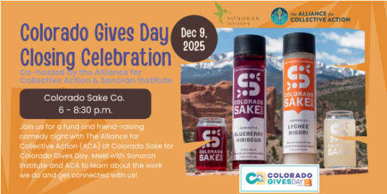 Colorado Sake Co. 3559 Larimer St, Denver, CO, United StatesJoin us for a fund and friend-raising comedy night with The Alliance for Collective Action (The Alliance) at Colorado Sake for Colorado Gives Day. Meet with Sonoran Institute and The Alliance to learn about the work we do and get connected with us! We are hosting a 50/50 raffle where folks buy raffle tickets; the […]