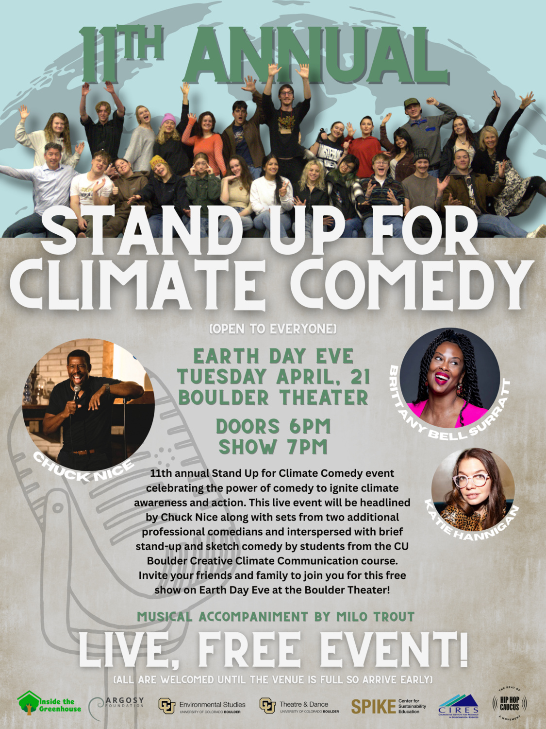 Boulder Theater 2032 14th Street,, Downtown Boulder, CO, United StatesDon't miss the 11th annual Stand Up for Climate Comedy event celebrating the power of comedy to ignite climate awareness and action. This live event will be headlined by Chuck […]